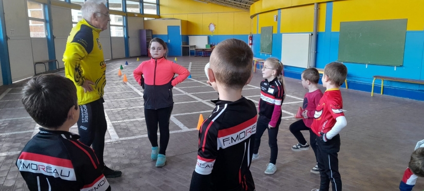 La météo et la température ne permettait pas de rouler à l'extérieur pour continuer l'apprentissage du cyclo cross, c'est donc à l'abri du préau que les séances de PPG (sans oublier la plus facile et aimée!! LA CHAISE.) ont débutées ainsi que pour l'apprentissage de la maniabilité du vélo, seul et en groupe, sous l'oeil du coach Christian aidé de Corinne
